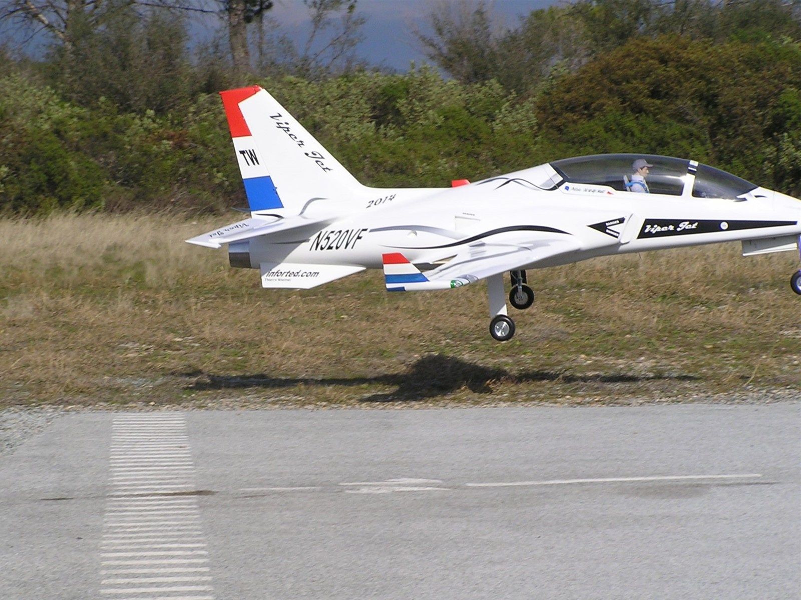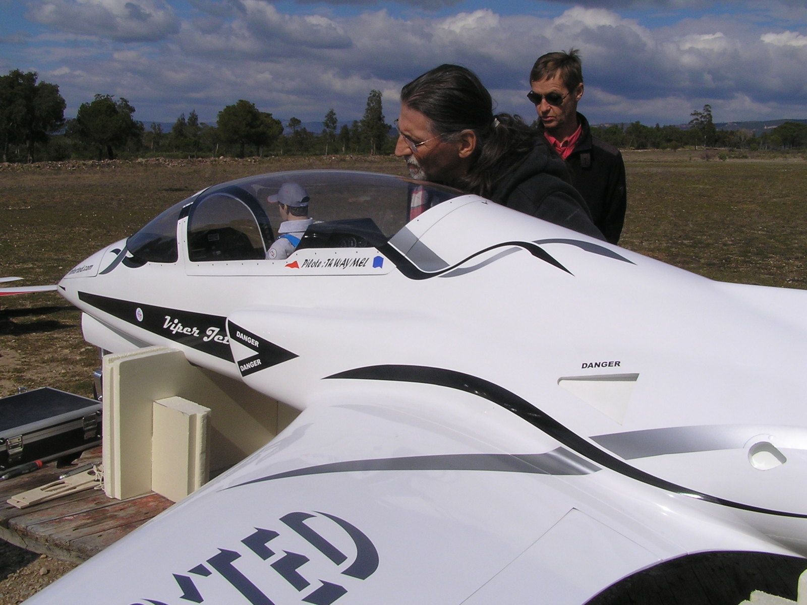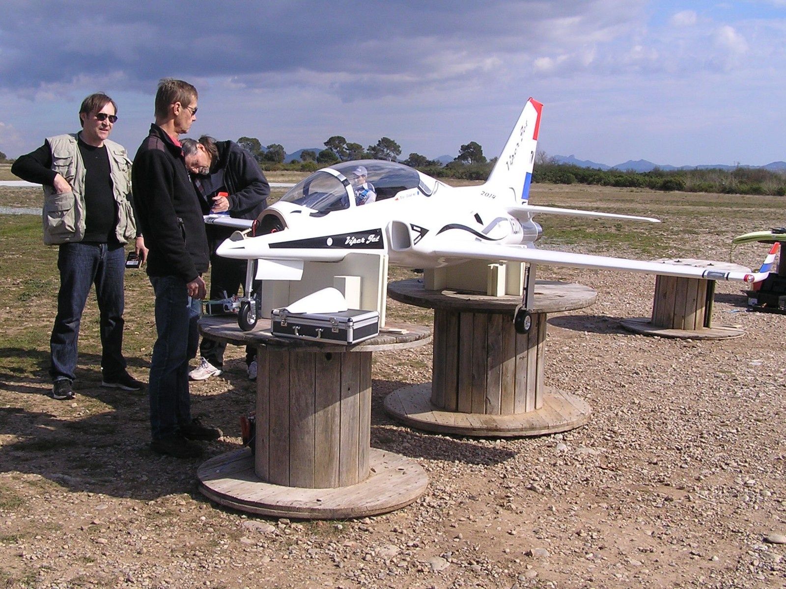 Mon avion parait minusculement petit quand je croise la Viper Jet sur la piste, et franchement pas au point, à moins que ce soit le pilote. Problème au second vol ou le moteur s'est étouffé au décollage, puis à calé lors du virage à gauche. Vent arrière, j'ai mal estimé la zone d'atterrissage et terminé sur le chemin en arrachant le train principal. Les deux ailes sont légèrement endommagées coté intrados.